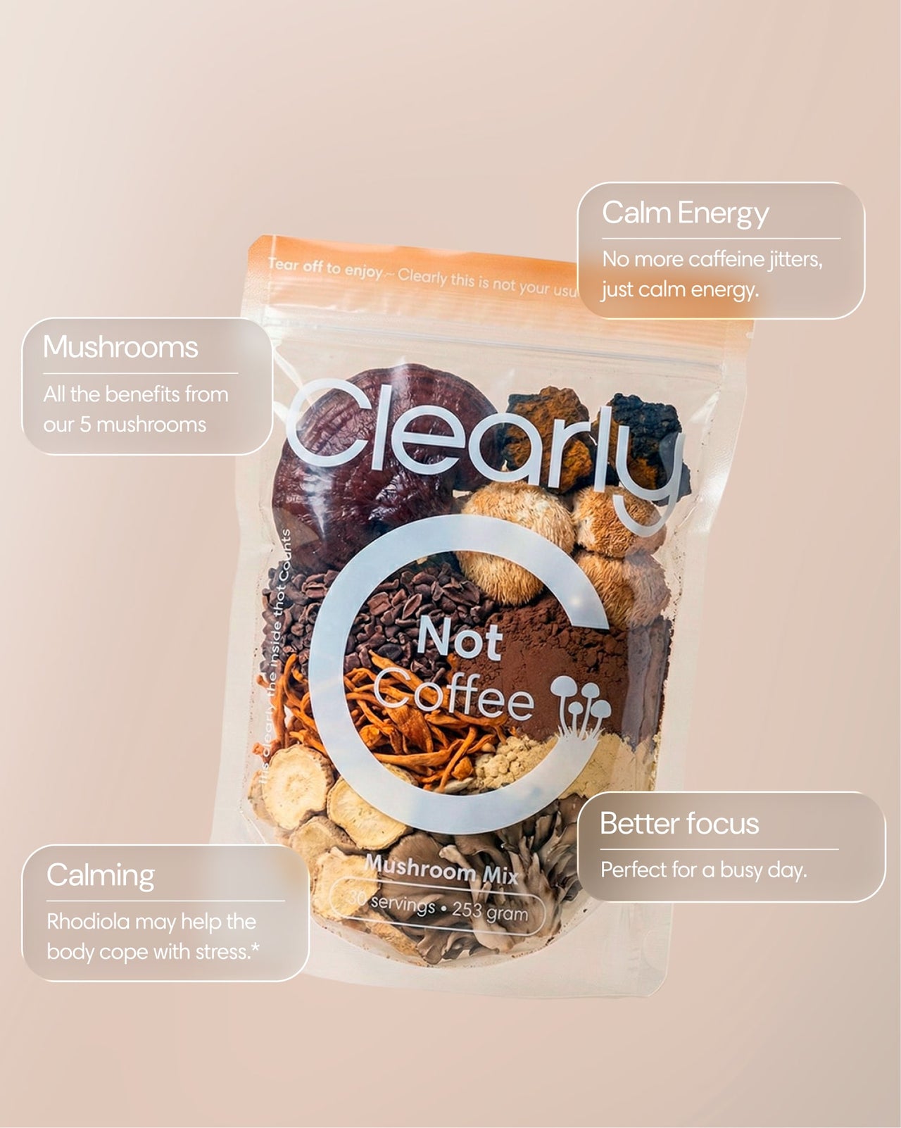 Making the perfect cup of Not Coffee is easy! Scoop one tablespoon into a cup, add hot water, and stir well. You can drink it as-is or customize it with (plant-based) milk, honey, or a scoop of Clearly Collagen.